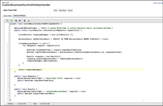 - Seleccione la clase de Apex CustomBusinessHourAndHolidayHandler .