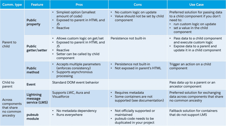 Al crear aplicaciones con Lightning Web Components (LWC), los desarrolladores necesitan pasar información a través de los componentes para compartir el estado y volver a renderizar los componentes. En esta publicación, compartiré una descripción general de los diferentes patrones de comunicación junto con sus ventajas y casos de uso. Veremos los tres tipos de intercambios: