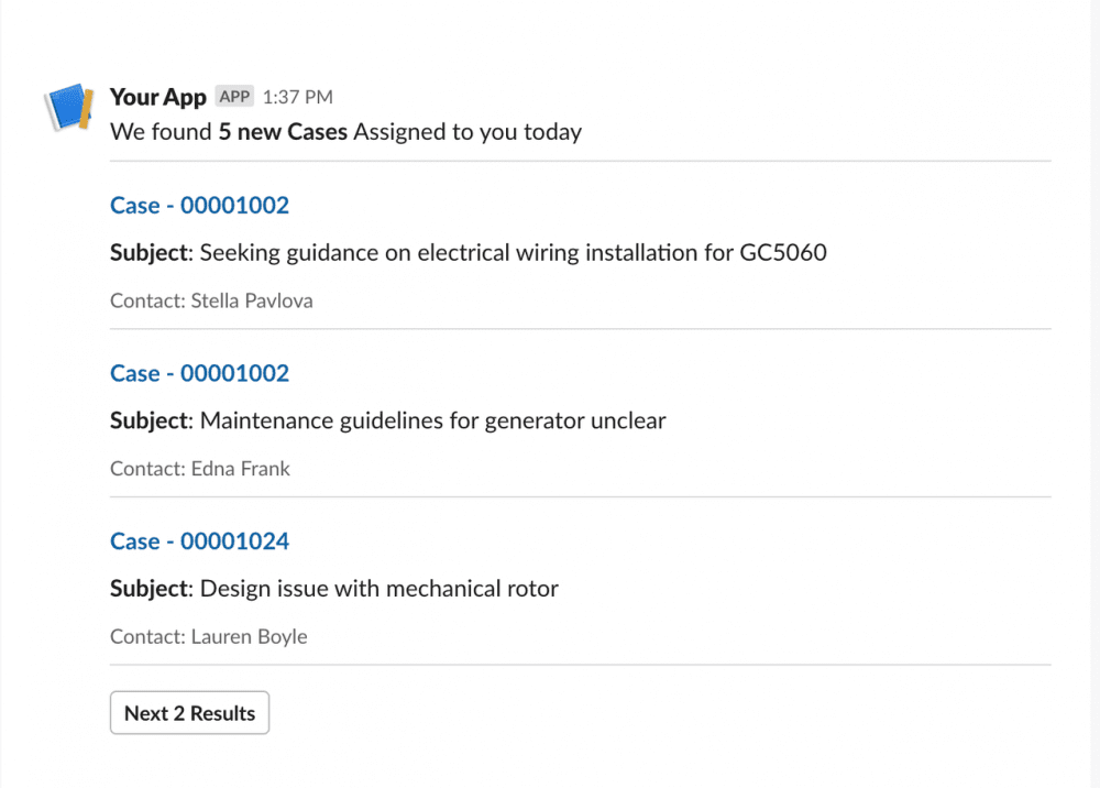 { "bloques": [ { "tipo": "sección", "texto": { "tipo": "mrkdwn", "text": "Encontramos * 5 nuevos casos * asignados a usted hoy" } }, { "tipo": "divisor" }, { "tipo": "sección", "texto": { "tipo": "mrkdwn", "text": "* <https://cmpaura-dev-ed.lightning.force.com/lightning/r/Case/5003t00001Ah6vmAAB/view|Case - 00001002> * nn * Asunto *: Buscando orientación sobre la instalación del cableado eléctrico para GC5060 " } }, { "tipo": "contexto", "elementos": [ { "type": "plain_text", "emoji": cierto, "text": "Contacto: Stella Pavlova" } ] }, { "tipo": "divisor" }, { "tipo": "sección", "texto": { "tipo": "mrkdwn", "text": "* <https://cmpaura-dev-ed.lightning.force.com/lightning/r/Case/5003t00001Ah6w0AAB/view|Case - 00001002> * nn * Asunto *: Las pautas de mantenimiento para el generador no están claras" } }, { "tipo": "contexto", "elementos": [ { "type": "plain_text", "emoji": cierto, "text": "Contacto: Edna Frank" } ] }, { "tipo": "divisor" }, { "tipo": "sección", "texto": { "tipo": "mrkdwn", "text": "* <https: //cmpaura-dev-ed.lightning.force.com/lightning/r/Case/5003t00001Ah6w8AAB/view | Case - 00001024> * nn * Asunto *: Problema de diseño con rotor mecánico" } }, { "tipo": "contexto", "elementos": [ { "type": "plain_text", "emoji": cierto, "text": "Contacto: Lauren Boyle" } ] }, { "tipo": "divisor" }, { "tipo": "acciones", "elementos": [ { "tipo": "botón", "texto": { "type": "plain_text", "emoji": cierto, "text": "Próximos 2 resultados" }, "valor": "click_me_123" } ] } ]