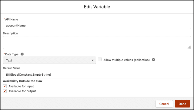 - get inputVariables() es un método captador que devuelve una matriz de objetos, que representa variables de entrada para un flujo. En este caso, devuelve el nombre de la cuenta.