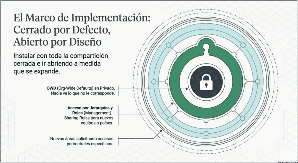 En lugar de partir de un modelo abierto y tratar de cerrarlo después (lo que genera retrabajo masivo), se parte de un modelo restrictivo y se otorgan permisos de forma controlada según las necesidades reales del negocio.