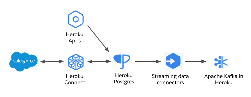 Heroku Connect , un potente servicio complementario de Heroku, es una solución de sincronización de datos que sincroniza automáticamente datos entre Heroku Postgres y una organización de Salesforce, lo que permite a los desarrolladores crear rápidamente aplicaciones escalables y elásticas que se basan en datos de Salesforce. Disminuye la carga de los desarrolladores encargados de la sincronización de datos entre aplicaciones y Salesforce. Heroku Connect también se conecta a otros servicios de Heroku (p. ej., Apache Kafka en Heroku , Heroku Data para Redis, conectores de transmisión de datos y está disponible a través del mercado de Heroku Elements ). No hay mejor solución para sincronizar datos entre Salesforce y las aplicaciones orientadas al cliente sin alcanzar los límites de la API.